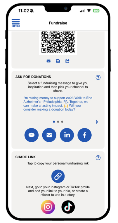 💡 Helpful tip: We’ve added a social share section on the Fundraise screen in your mobile app. Users can copy their personal page link and seamlessly add it to Instagram or TikTok, including Instagram’s Link Stickers. These stickers let participants add a clickable link in their Stories, driving traffic straight to their fundraising page.